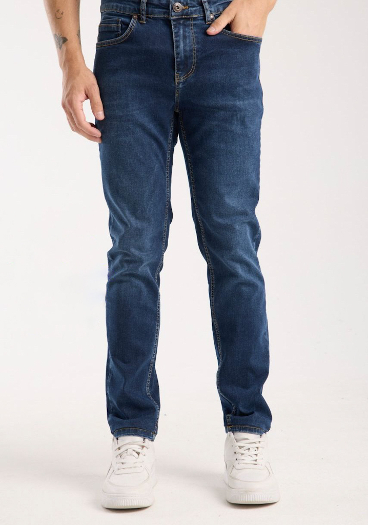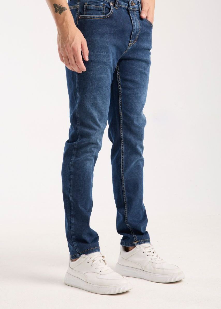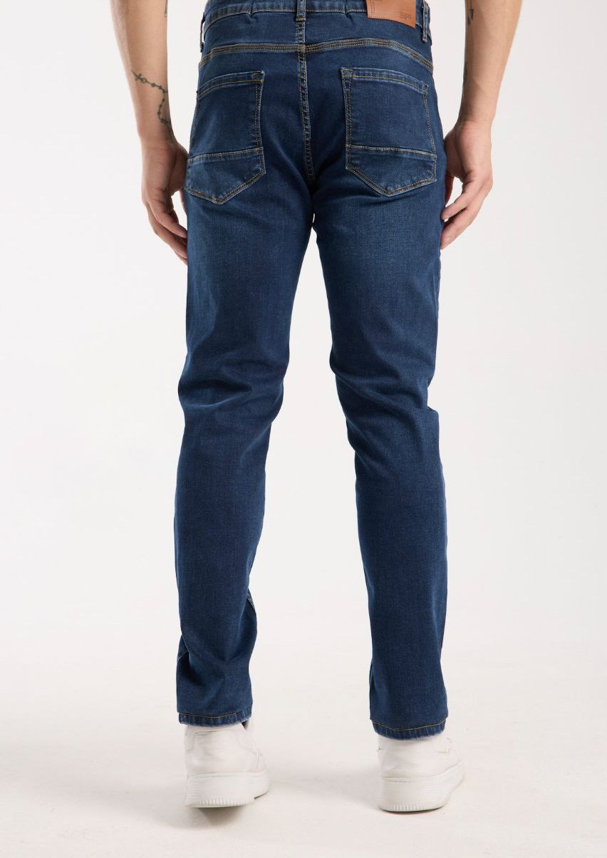 Фармерки во темносина боја со умерено стеснети ногавици.
