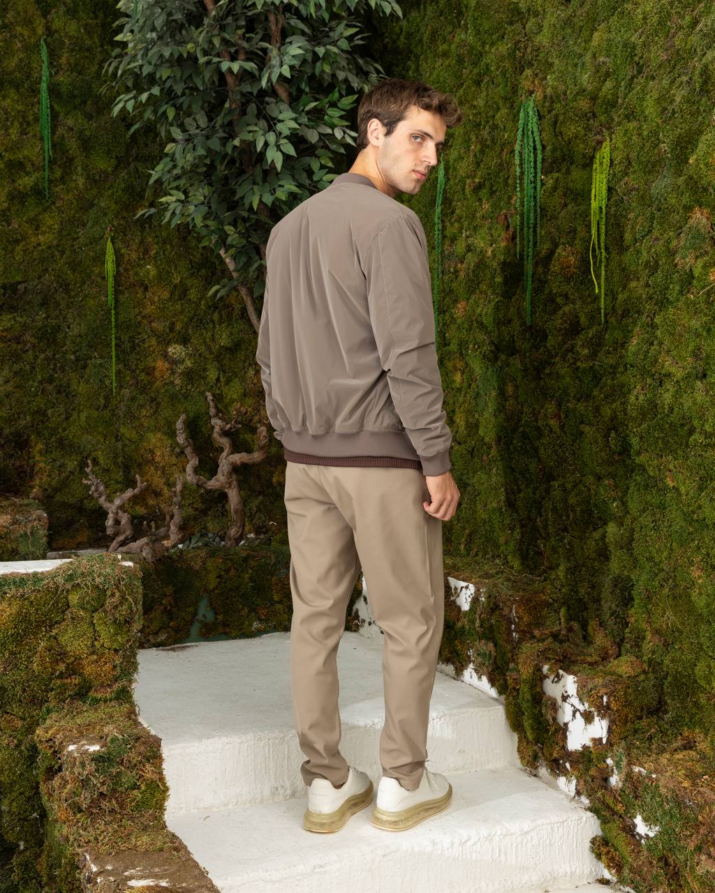 Јакна во бомбер стил со кафена нијанса, умерено струкирана.