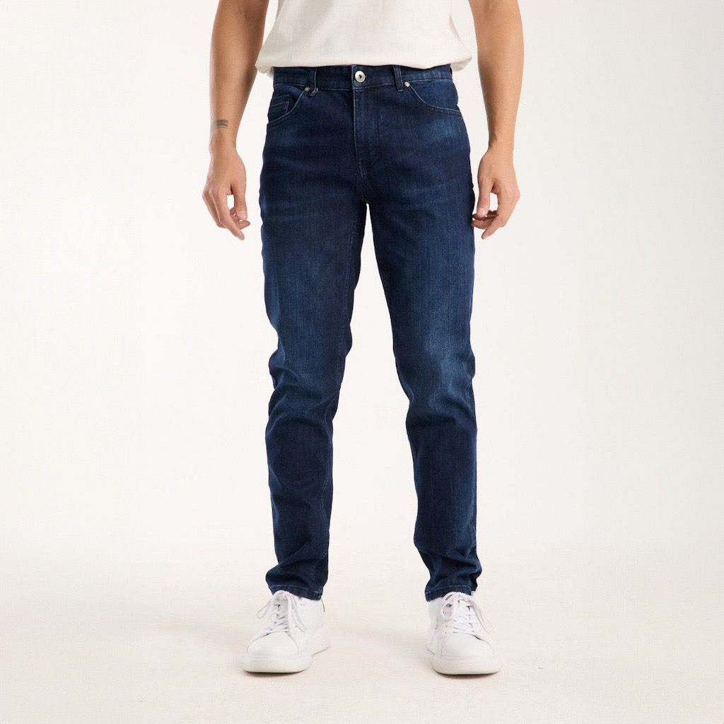 Фармерки во темносина боја со умерено стеснети ногавици.